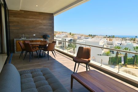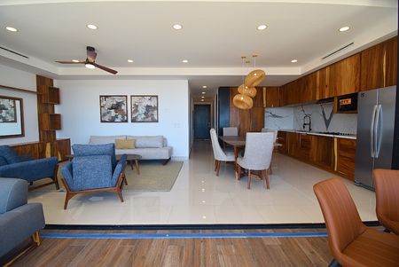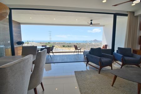 Floor-to-ceiling sliding doors in the living and dining rooms open to a large covered outdoor entertaining area with panoramic views of the famous Cabo San Lucas Lands End. The unit comes highly equipped offers countertops, custom cabinetry, as well as stainless steel appliances.