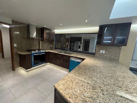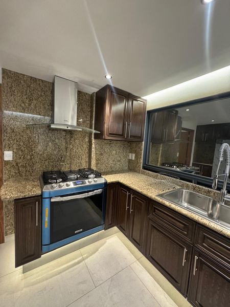Cocina integral equipada con planchas de granito y caoba entablerada, gabinetes con cristal, vistas panorámicas increíbles, alacena y despensa.