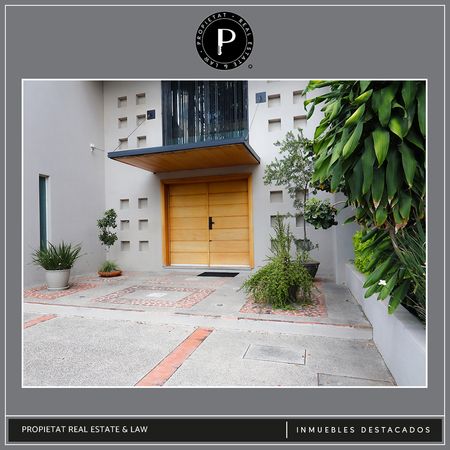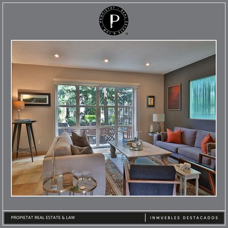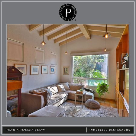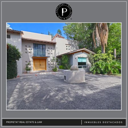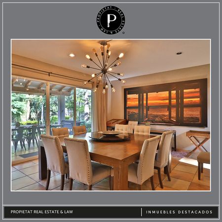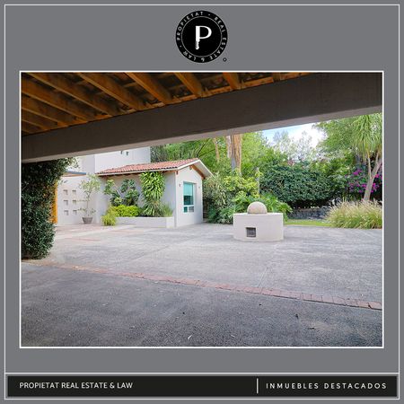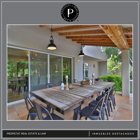 Sala, comedor, sala de tv, bar, cocina integral, estudio, terraza familiar, terraza para eventos, alberca, gran jardin, baños exteriores para los eventos, cochera techada para 4 autos pero suficiente espacio para 7 autos en patio, estudio de yoga y cuarto de servicio y lavado