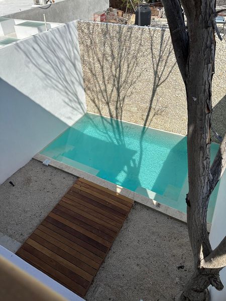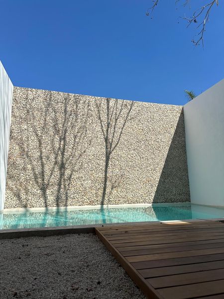 Piscina con acabado chukum y terraza con deck de madera cumaru, perfecta para disfrutar del clima tropical.