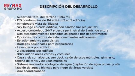 Cumbres Skyview, es un desarrollo de lujo, ubicado en una de las mejores zonas de Tijuana, B.C. con más de 8,000 M² de áreas verdes que cuentan con CCTV y espacios comunes, 100 condos de 113 a 145 M² en 5 edificios con acabados de lujo. Cuenta con una espectacular vista y seguridad las 24 horas del día". AMENIDADES: Estacionamiento techado, Skylounge en cada edificio con asador, Fire Pit, y Jacuzzi, Casa Club con alberca, JoggingTrack, Sundeck, Salón de usos múltiples, gimnasio, instalaciones deportivas, tiene una barda perimetral de 3 metros de altura, incluye un Sistema innovador Ecológico de agua, captación de agua pluvial y utilización de aguas blancas para riego de áreas verdes, diseño ecológico de fachadas ¡DISFRUTA DE UN AMBIENTE EXCLUSIVO CON AMENITIES PARA TODA LA FAMILIA!