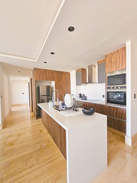Cocina abierta, equipada con elegantes acabados y diseñada para aprovechar al máximo cada espacio.