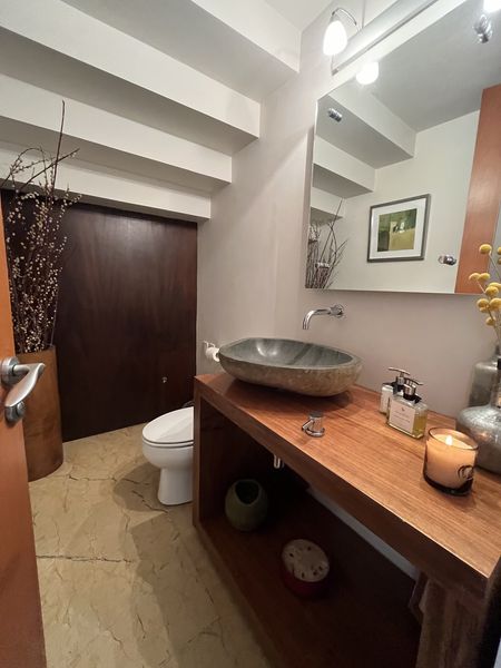 Cuenta además con paneles solares, captación de agua pluvial y de agua potable, así como calefacción hidronica en toda toda la casa.