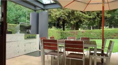 Terraza con asador y una gran chimenea, ideal para reuniones al aire libre.