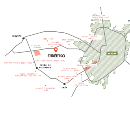 ENDÉMICO es un parque logístico con 456 lotes para situar negocios, bodegas, puntos de venta, oficinas, talleres ó estudios, que reúne todas las condiciones necesarias para las empresas que buscan crecer en el corazón industrial Mérida-Hunucmá.