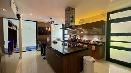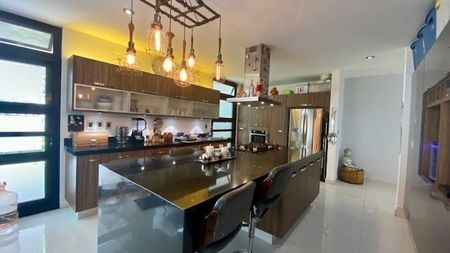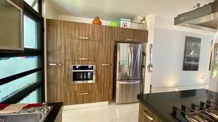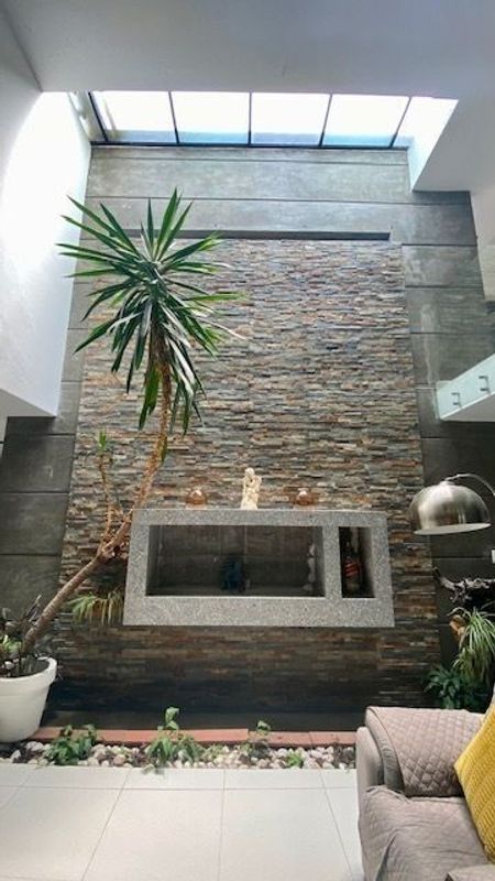 PB Recibidor, baño de visitas , Area de sala con doble altura y muro lloron forrado de piedra natural, comedor, cocina equipada con dobles cajones, mecanismo de cerrado lento , herrajes importados, lavadora de platos, electrodomesticos GE Profile, sensores de luces etc. terraza, jardin, alberca.