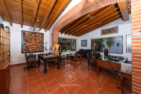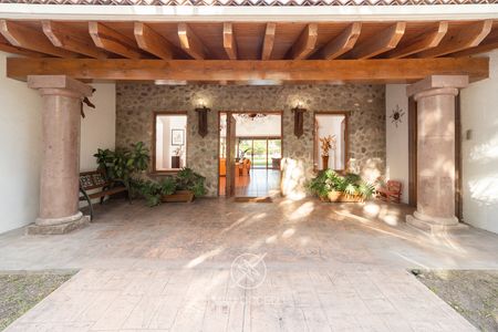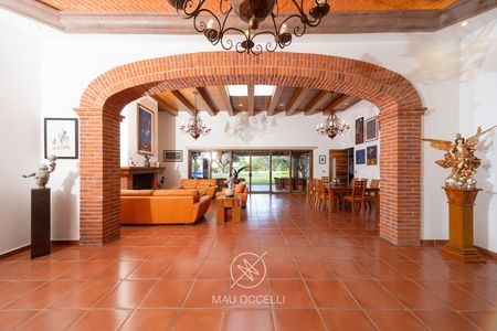 Gran espacio de estancia y comedor con generosa altura de piso a techo con vigas y gualdras de madera y cadiles ad-hoc al estlo de la casa.