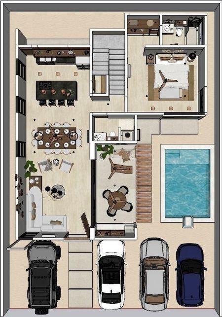• Diseño abierto que integra sala con doble altura, comedor y cocina con isla de granito para 4 personas. Cuenta con alacena oculta bajo la escalera para optimizar el espacio.