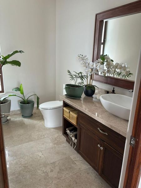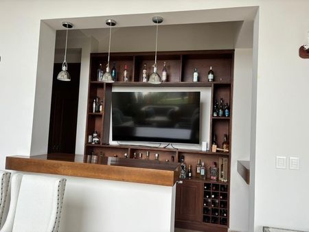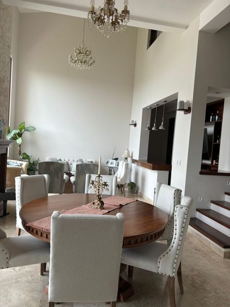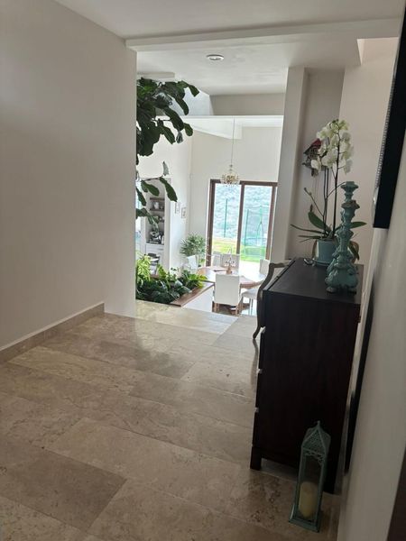 Entramos y llegamos a un amplio recibidor, a la derecha encontramos un estudio y medio baño de visitas. Bajando un desnivel encontramos la elegante sala a doble altura que conecta con un magnífico bar con bodega y con el confesor; que su vez conecta con la maravillosa cocina equipada con cubiertas en cuarzo y accesorios Italianos. Esta cocina tiene una amplia alacena, cuarto de servicio con baño completo y área de lavado.