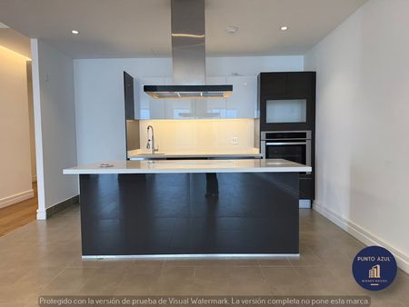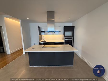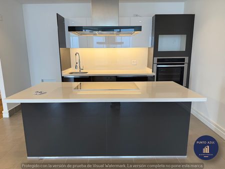 EN COCINA: plancha de corian blanco, piso de porcelanato, horno IO MABE, estufa electríca y campana IO MABE.