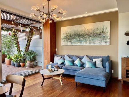 3 recámaras cada una con su baño, la principal con vestidor y todas con acceso al balcón. Sala, comedor, medio baño para visitas y cocina abierta. 86 metros de terraza con jardín y área para fogatero.. Cuarto de servicio con baño, 1 bodega y 2 lugares de estacionamiento techados e independientes.