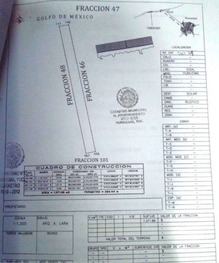 El Terreno esta frente al mar con 10 metros lineales de frente X 137 metros de fondo. Siendo una superficie total de 1,370 m2