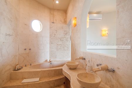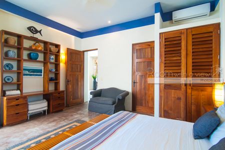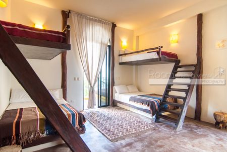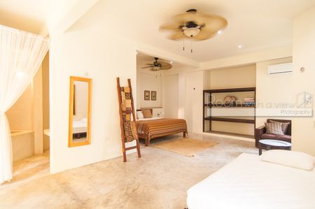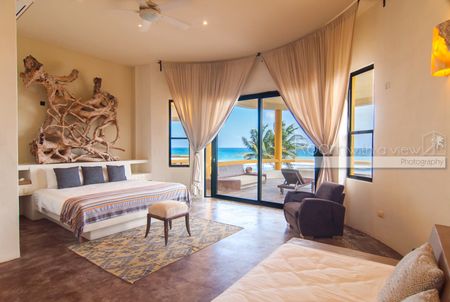 Esta villa de playa cuenta con nueve elegantes suites, cada una de 250 a 300 pies cuadrados, equipadas con camas king-size, lujosa ropa de cama y baños en suite. La suite principal de 1,000 pies cuadrados ofrece un balcón privado con vistas panorámicas al mar, creando un auténtico oasis de tranquilidad. Además, cinco serenas suites en el jardín, rodeadas de exuberante selva, cuentan con hamacas colgantes, balcones privados y baños de chukum artesanal, rindiendo homenaje a la herencia maya de la región. Para los más aventureros, una suite con literas y un área de descanso al aire libre ofrece vistas espectaculares a la selva y el mar.