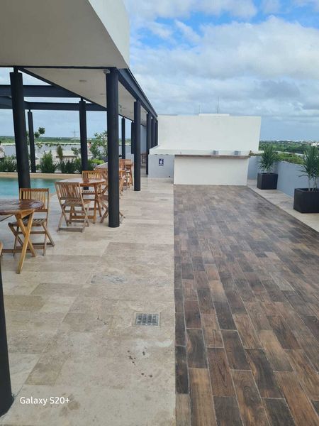 Consta de Cocina en concepto abierto con meseta de granito , carpinteria de triplay de cedro .Sala comedor , balcon , 2 recamaras con baño completo y closets
