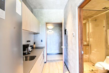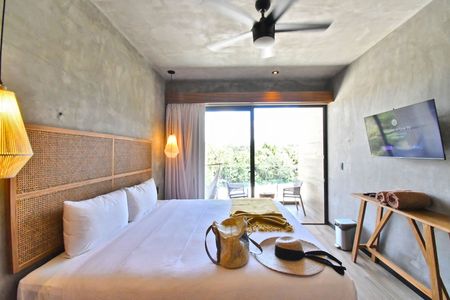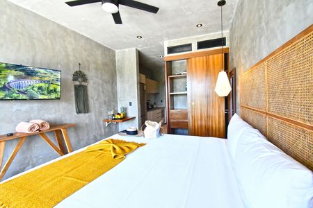 El estudio cuenta con una cocina totalmente equipada, aire acondicionado, decoración contemporánea y balcón privado para relajarte al final del día. Todo lo que necesitas para vivir y trabajar cómodamente en Tulum.