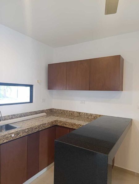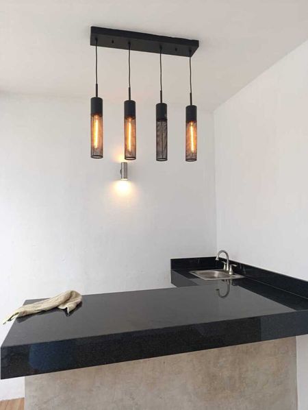 - Cocina con isla desayunadora y mesetas en granito, alacena con carpintería y gavetas inferiores y superiores.