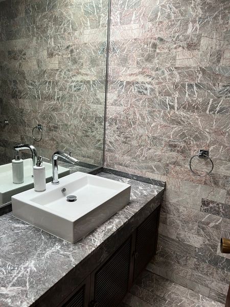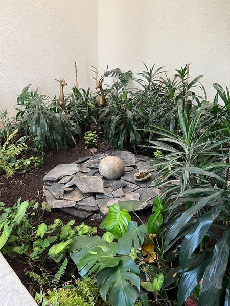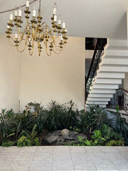 1er nivel. lobby con jardinera y fuente, sala de piano, sala muy amplia con chimenea 1/5 baño.