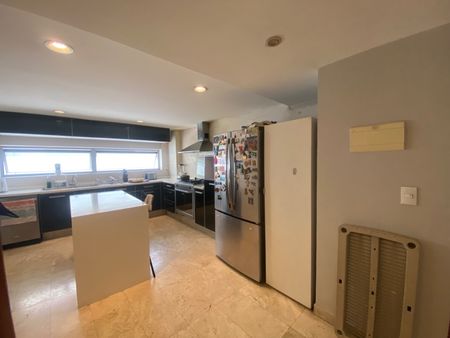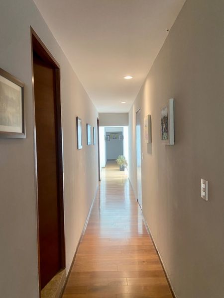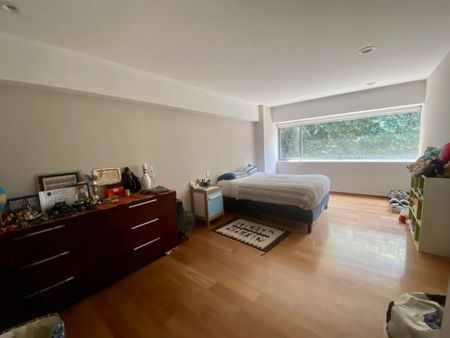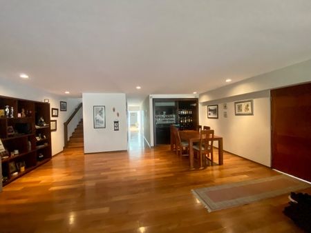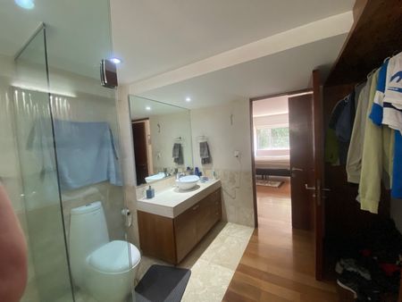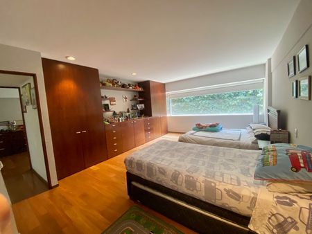 Segundo nivel: family Room, estudio, cuarto de lavado, muy amplia sala de tv con baño y salida a gran terraza social. Recámara principal con terraza privada rodeada de vista arbolada, baño con ducha y tina, muy amplio vestidor. 3 estacionamientos y bodega.