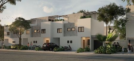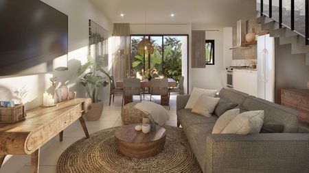 Estas nuevas casas adosadas de lujo presentan un amplio espacio de estar abierto con ventanas en varias direcciones que permiten una agradable brisa cruzada y luz natural. Cuentan con una cocina totalmente equipada, una sala de estar y comedor llenos de luz solar, un cuarto de lavado y un medio baño en el piso principal. Tienen 2 o 3 recámaras con clósets incorporados y baños completos en suite. Todas las casas cuentan con terrazas privadas en el rooftop y su propio patio y jardín que se abre al jardín central con una alberca comunitaria y áreas de estar al aire libre. Se ofrecen en venta sin amueblar pero equipadas con electrodomésticos, aire acondicionado, paneles solares y muchas otras características. Paquetes de muebles están disponibles para comprar directamente con el desarrollador.