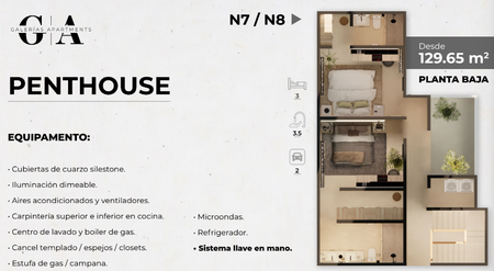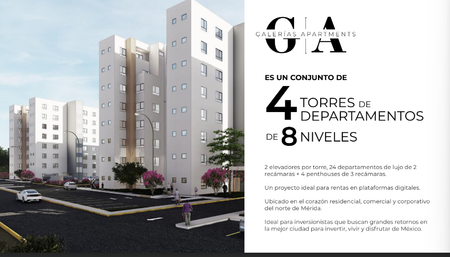 GALERÍAS APARTMENTS es un conjunto de 4 torres de departamentos de 8 niveles, 2 elevadores por torre, 24 departamentos de lujo de 2 recámaras y 4 penthouses de 3 recámaras.