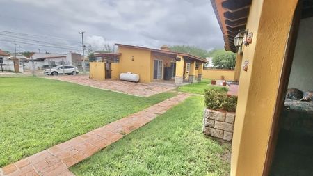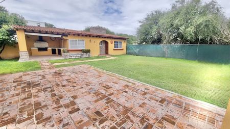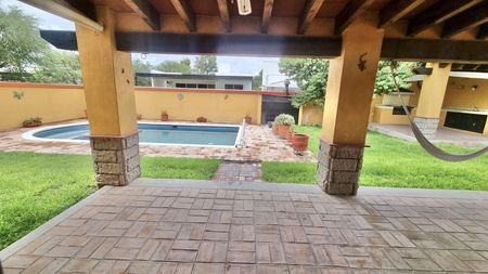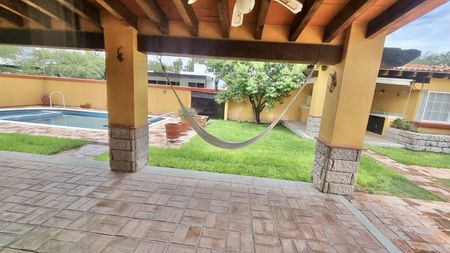 Casa de buen diseño desplantada en un solo piso. Estancia se abre a patio con terraza techada con asador, jardín y alberca. Cuenta con funcional Cocina integral equipada.3 habitaciones amplias en casa 2 en casa de visitas. En total con 4 baños completos. En excelente estado de Conservación. Con estacionamiento de 2 a 5 autos.