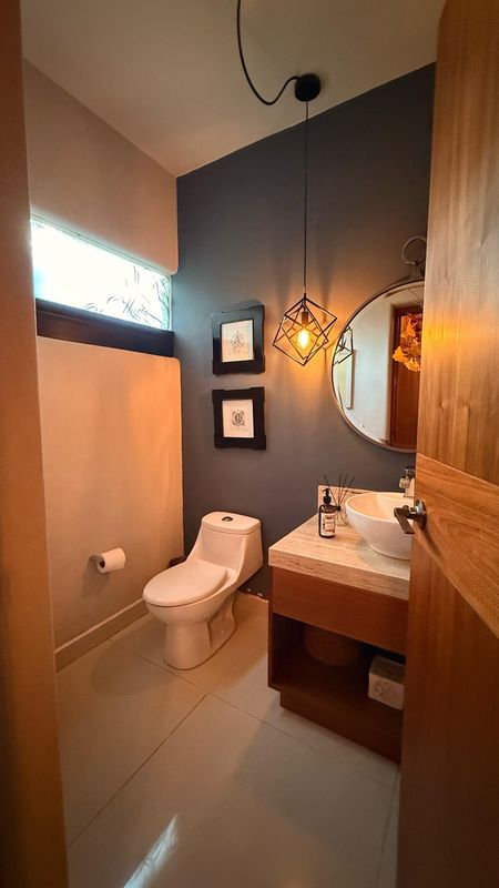 — Dos medios baños y regadera, integrados armónicamente con la vista del jardín.