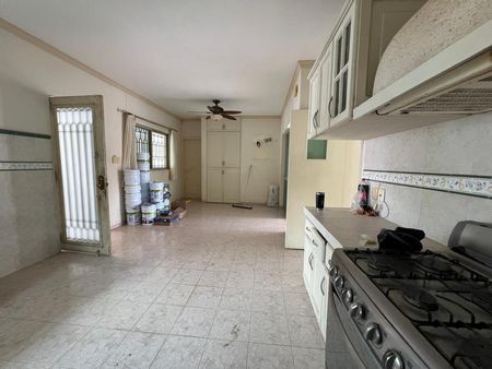 Cocina con área de desayunador con ventilador . Tanque de gas estacionario .