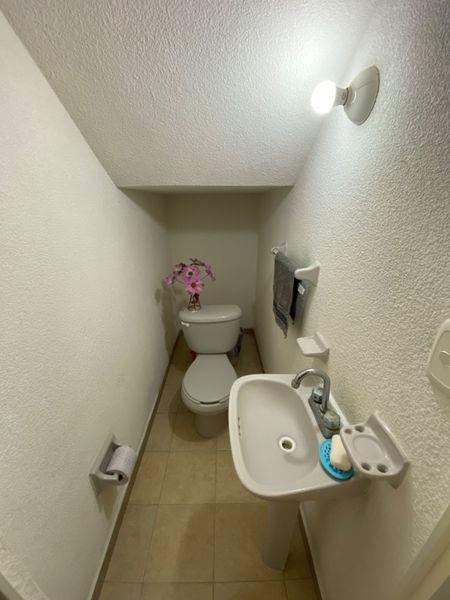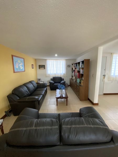 - Planta baja: Cochera para un auto, recibidor, sala, comedor, cocina equipada, medio baño y patio de servicio.