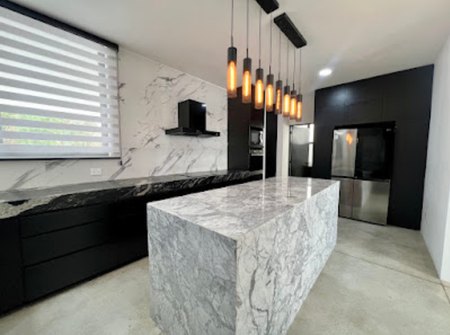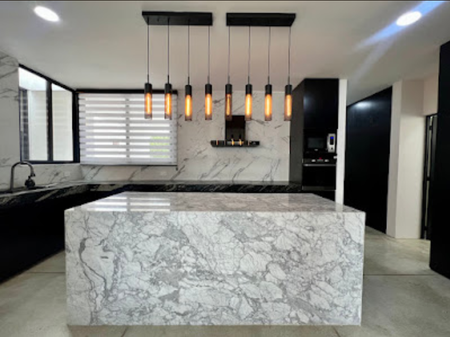 Carpintería en toda la cocina y recubrimiento en mármol calacatta y granito