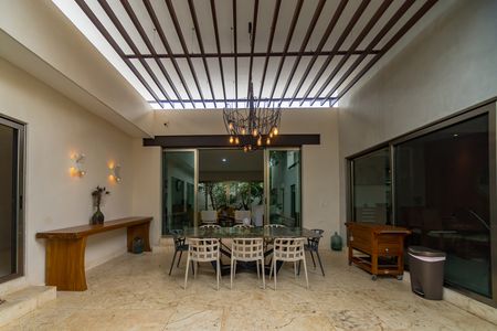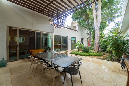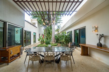 La joya de esta casa es su **terraza techada con jardín**, enmarcada por árboles que alcanzan hasta los 7 metros de altura. Ideal para reuniones, la zona de **asoleaderos** y **bar** se complementa con una **piscina equipada con mosaicos venecianos, cascada y calefacción**, diseñada para relajarse con estilo. Todo esto acompañado de baños completos para mayor comodidad y un sistema de riego automatizado que mantiene el jardín impecable.