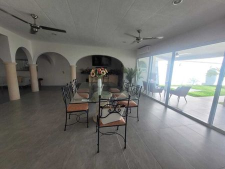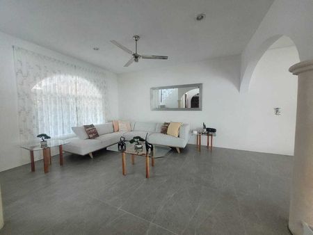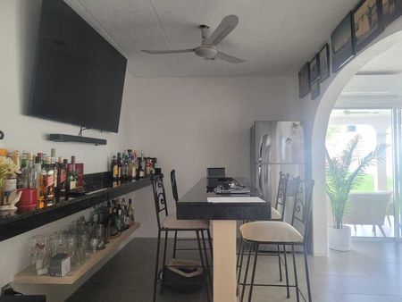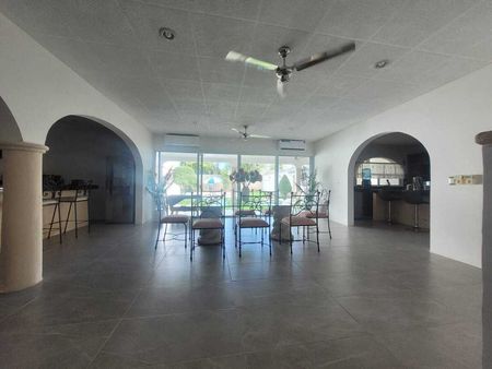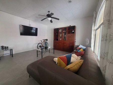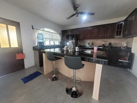 Amplio jardin con terraza techada, ventiladores de techo, baño completo.