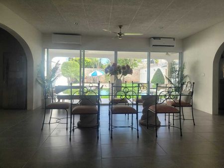 Comedor con ventanal techo a piso con vista al jardin y dos aires acondicionados.