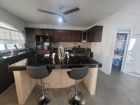 Cocina equipada con gavetas de madera, meseta de granito, isla con meseta de granito, alacena independiente.