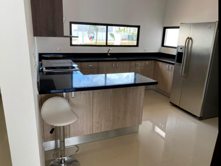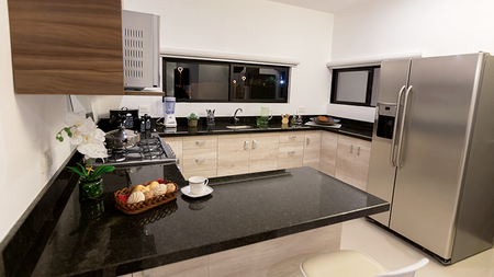 Cocina con gabinetes y meseta de granito