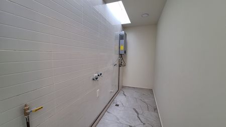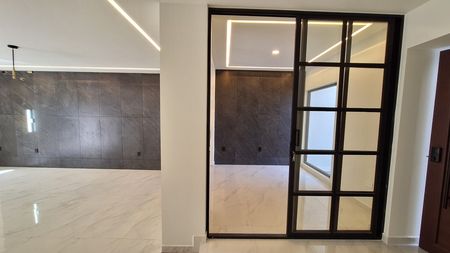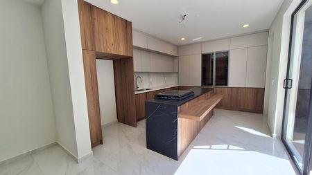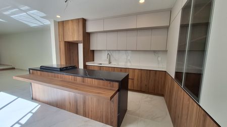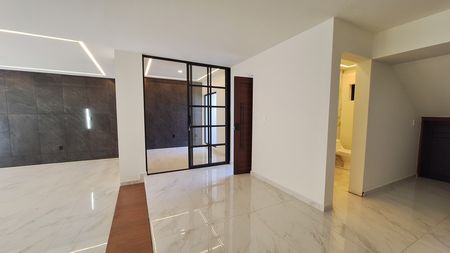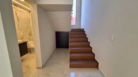 - Planta baja: Cochera para 1 auto, estudio, sala, comedor, cocina equipada con alacena, medio baño, jardín y cuarto de lavado, pequeño espacio de almacenamiento bajo las escaleras.