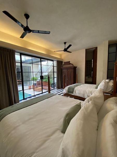 * Recamara secundaria con closet vestido y baño completo, equipada con Ventilador, AA y cortinas con vista a terraza y piscina