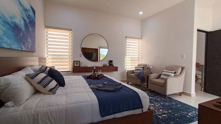 Residencia de tres niveles, que se distingue por su recámara principal tipo penthouse con baño privado, área de walking closet, y una terraza la cual te permitirá disfrutar de los hermosos atardeceres característicos de la Rivera maya.
