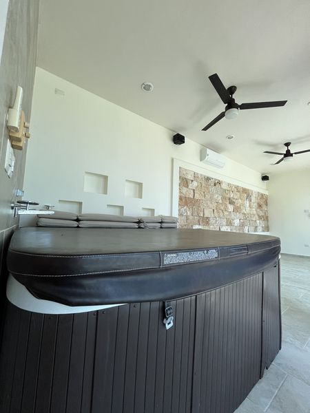 Un jacuzzi techado en un área social cerrado con vista hacia el jardín y piscina.