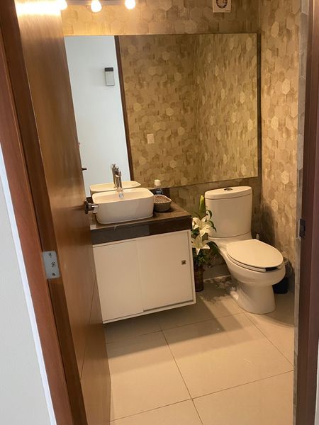 *½ baño de visitas, extractor Axial de pared, doble iluminación. *Carpintería, mesa de granito, espejo completo de pared.