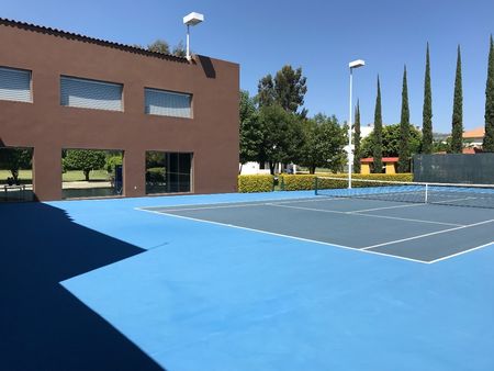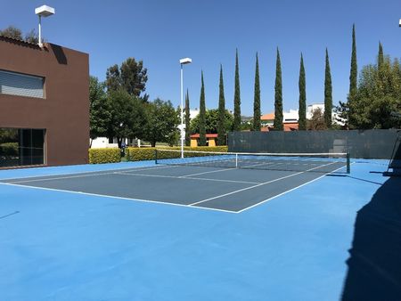 La casa cuenta con dos cocheras techadas, una para 2 autos, y otra para 4 autos, cancha de tenis profesional totalmente iluminada.
