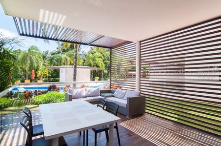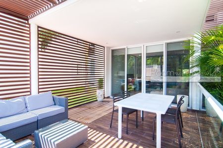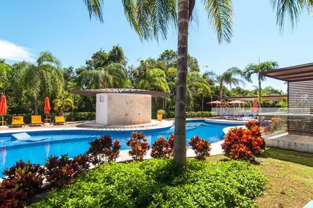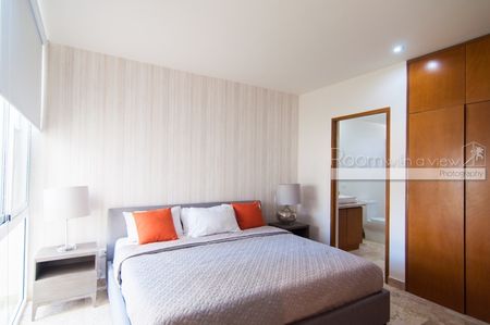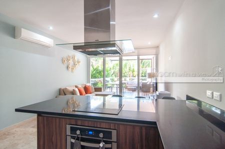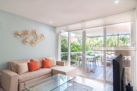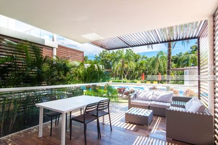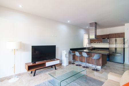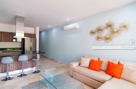 Este departamento luminoso y moderno de 2 recámaras y 2 baños en planta baja cuenta con 127 m2 de construcción. Tiene una hermosa cocina moderna con barra para desayunos y electrodomésticos de primera calidad que incluyen refrigerador, lavaplatos, microondas, horno y estufa con campana. La distribuciñon es abierta con la cocina y la sala que se abren a una terraza de buen tamaño con vistas a la alberca y al jardín, perfecta para tomar su café y desayuno por la mañana. Este departamento está muy bien mantenido con pisos de loza y acabados de primera calidad. Viene equipado con todas las comodidades que puede esperar, incluyendo aire acondicionado y centro de lavado.