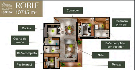 El departamento cuenta con área de sala y comedor muy iluminada pues cuenta con terraza en escuadra, cocina equipada, cuarto de lavado. Dos recamaras, la principal con vestidor y baño completo.