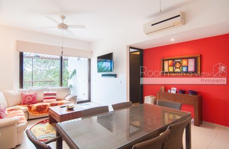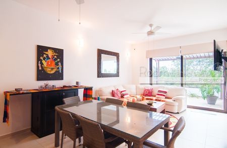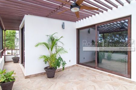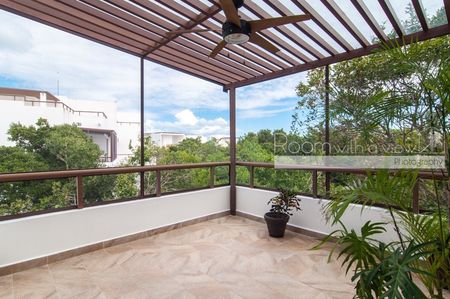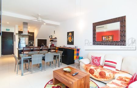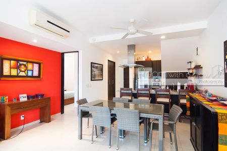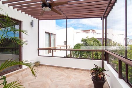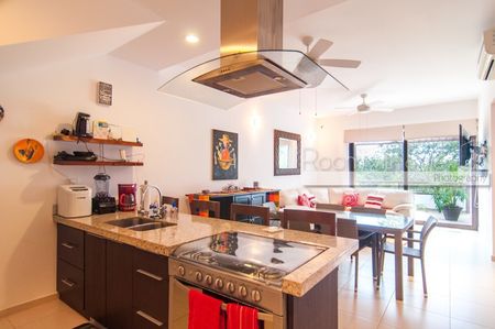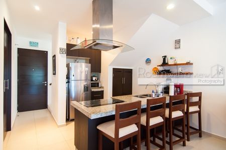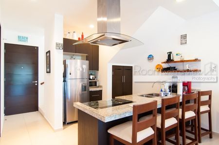 Este penthouse de 2 recámaras y 2 baños ofrece una distribución abierta y mucho sol caribeño. Cuenta con cocina completamente equipada, isla para desayunos y closet de lavado con lavadora y secadora. El área de estar y la recámara principal se abren a una espaciosa terraza, ideal para disfrutar su café y desayuno por la mañana o una copa de vino por la tarde. Este lujoso penthouse también ofrece un enorme roofotp con jacuzzi y vistas panorámicas. Se ofrece a la venta completamente equipado y amueblado, listo para que lo haga suyo. Este departamento cuenta con energía solar y sistema de agua potable por osmosis.