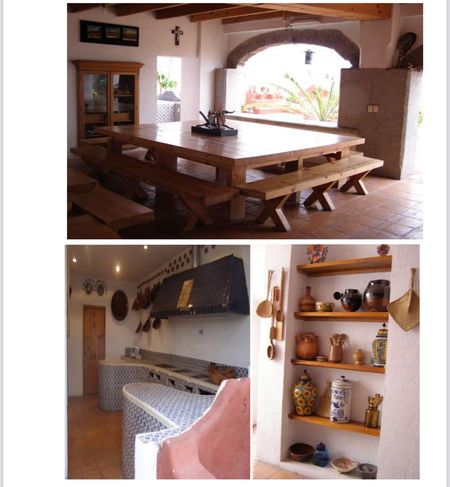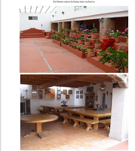 Recamara 1 y 2.- con vestidor grande y baño cada una. Recamara 3 Principal, con sala de estar, Green House, chimenea, tina jacuzzi, baño con bidet y 2 vestidores grandes. SALÓN DE RECEPCIONES TODA ESTÁ ÁREA ES MUY GRANDE Patio de estar techado tipo Green House, con 4 bancas empotradas tipo colonial, un hermoso porta macetero de malvones muy grande que llenan de colorido el área. Esta área alberga mesas de jardín, para estar o comer para 35 personas o más. Acceso al salón techado, a través de 6 medios puntos coloniales de demolición originales. Cocina grande de talavera, con extractor y asador de carnes, despensa muy grande. Comedor con dos mesas con atractivo diseño para sentar a 44 gentes. Esta área tiene una chimenea muy grande Sala formal con bar, con instalación de televisión SKY Baños hombres y baños mujeres. En el mismo salón, lateralmente tiene en forma independiente 2 dormitorios familiares para invitados que cuentan cada uno con baño, y calentador grande .closet, cama matrimonial, cama individual y literas, para toda una familia. O sea Padres e Hijos. Servicio para trabajadores, con baño y cocina y comedor., Sillero. Despacho o estudio independiente, adaptado a la fachada EXTERIORES Cuenta todavía con 12 caballerizas con comedero y bebedero, sillero. Picadero muy grande, pastúrero que fue para 5000 pacas o bodega.