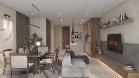 -Sala, Comedor y Cocina en concepto abierto con barra desayunadora.