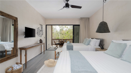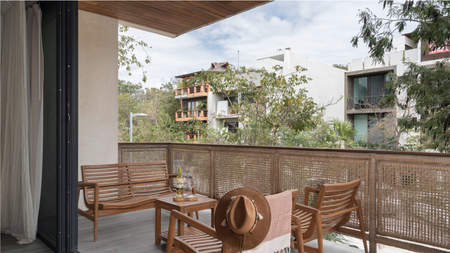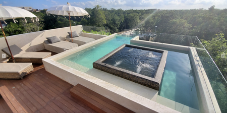 Deck de madera : Equipado con 6 camastros y una sala con sombrilla para disfrutar del sol y la brisa de Tulum