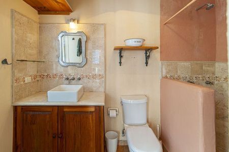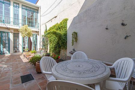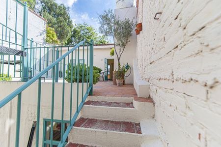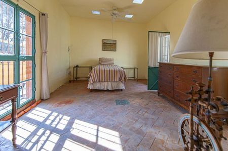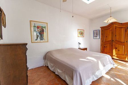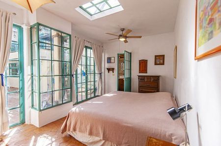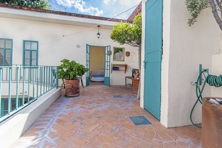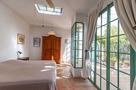 A sunny garden patio stretches from the main house to the king – size bedroom with adjoining bath. On the second floor of the main house is a terrace that fronts a spacious single bedroom with fireplace, walk -in closet and bath with tub and shower. Opposite to this room you can find a very sunny studio.