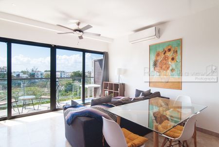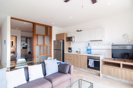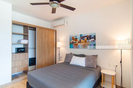 El departamento ofrece un plano abierto con cocina totalmente equipada, sala y comedor llenos de luz natural, y un balcón privado con vista a la ciudad. Se vende completamente amueblado y equipado con ventiladores de techo, aire acondicionado y acabados de primera calidad. Como parte del complejo Ipana, también podrá disfrutar de excelentes amenidades como una espectacular alberca en el rooftop con vista panorámica al mar, gimnasio, lobby estilo hotel y seguridad las 24 horas.