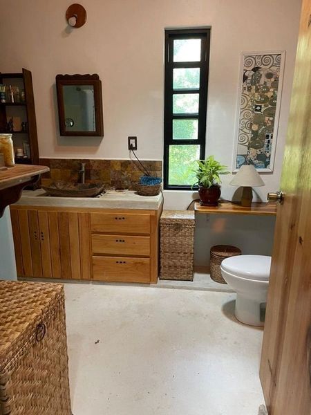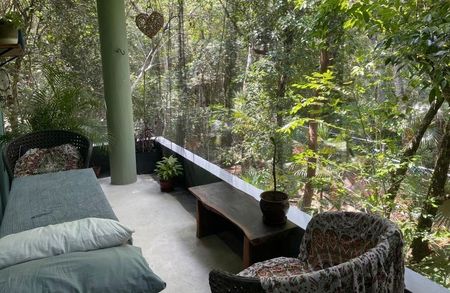 El piso inferior de esta casa originalmente fue diseñado para ser dos establos, pero ahora podría convertirse fácilmente en un área de trabajo o en más habitaciones y/o espacio habitable. El piso superior cuenta con una suite muy amplia con cocina y sala de estar abierta, un baño bien equipado y dos terrazas. En un piso más arriba, hay una terraza en la azotea de buen tamaño con hermosas vistas a través de las copas de los árboles, perfecta para tomar el sol, observar las estrellas y observar la vida silvestre local, como aves tropicales y monos. Esta eco-casa en la selva se ofrece en venta sin muebles y lista para que la personalice a su gusto.