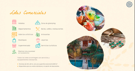 Lotes Comerciales y de servicios: En su plan maestro se han concebido espectaculares zonas comerciales y de servicios estratégicamente localizadas en las diferentes zonas de acceso al complejo. Hoteles, Departamentos, Galerías artísticas, Boutiques, Supermercado, zona de gampling, Bares ,cafés y restaurantes, Artesanías, Joyerías, Servicios turísticos. Terrenos de 50x20